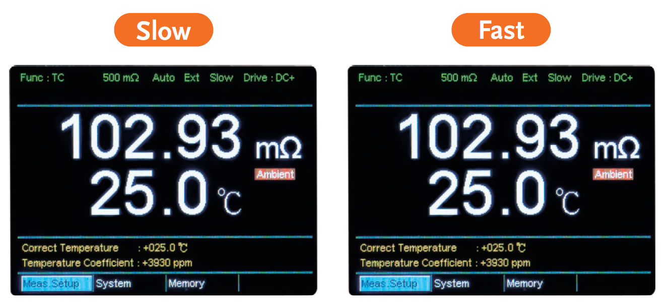 Deux vitesses de mesure sont disponibles : rapide (60 lectures/s) et lente (10 lectures/s). La résolution d’affichage reste maximale quel que soit le mode.