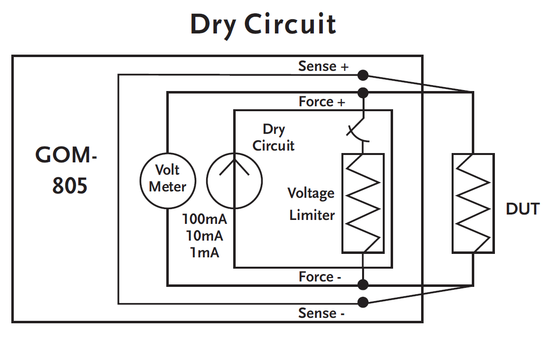 Limite la tension et le courant de test pour éviter d’endommager les surfaces de contact. Trois niveaux de Dry circuit sont disponibles : 500 mΩ / 100 mA, 5 Ω / 10 mA, 50 Ω / 1 mA.