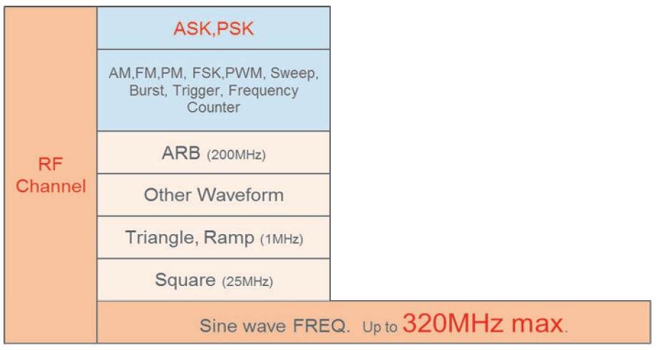Le générateur de signaux RF intégré agit comme une source complète de signaux AFG, incluant la génération de formes d’onde arbitraires. Il prend en charge différentes modulations, des fonctions de balayage de fréquence ainsi que des modulations numériques telles que ASK et PSK. La fréquence maximale de l’onde sinusoïdale peut atteindre 320 MHz.
