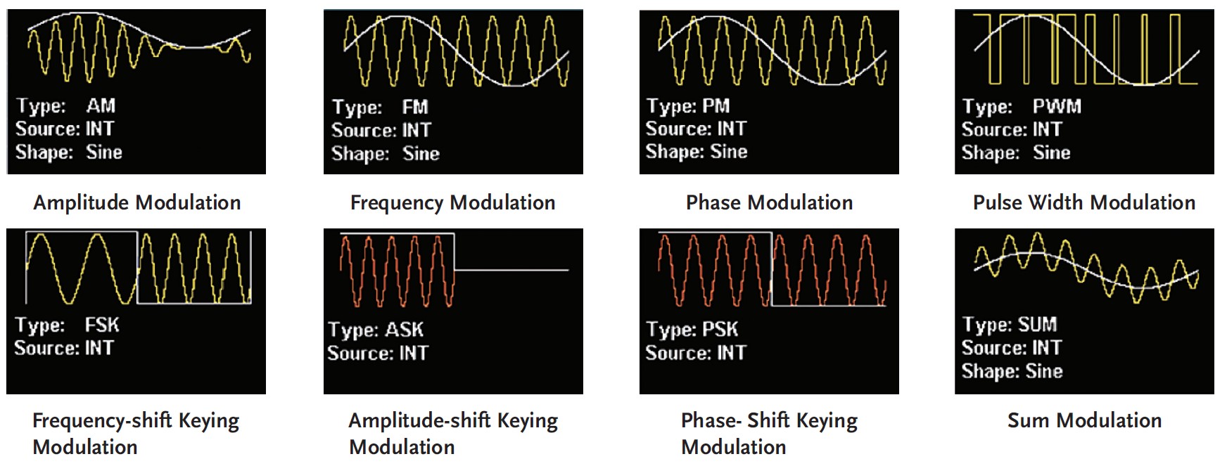 La série prend en charge différents types de modulation, notamment AM, FM, PM, FSK, PWM et SUM.