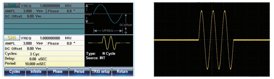 La série prend en charge les modes de déclenchement par nombre de périodes (N-cycle) ou par porte (gated trigger).