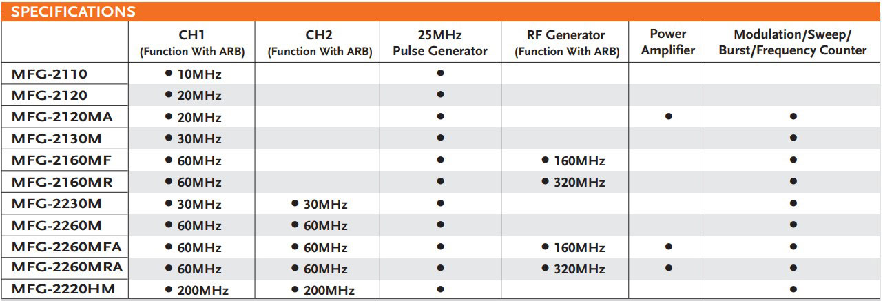 Ces cinq types de fonctions sont répartis sur 11 modèles différents, allant du générateur de fonctions arbitraires monocanal de base avec générateur d’impulsions jusqu’aux modèles complets à cinq canaux. Cette architecture flexible permet à la série MFG-2000 de répondre aux besoins d’un large éventail d’applications éducatives, de laboratoire et industrielles.